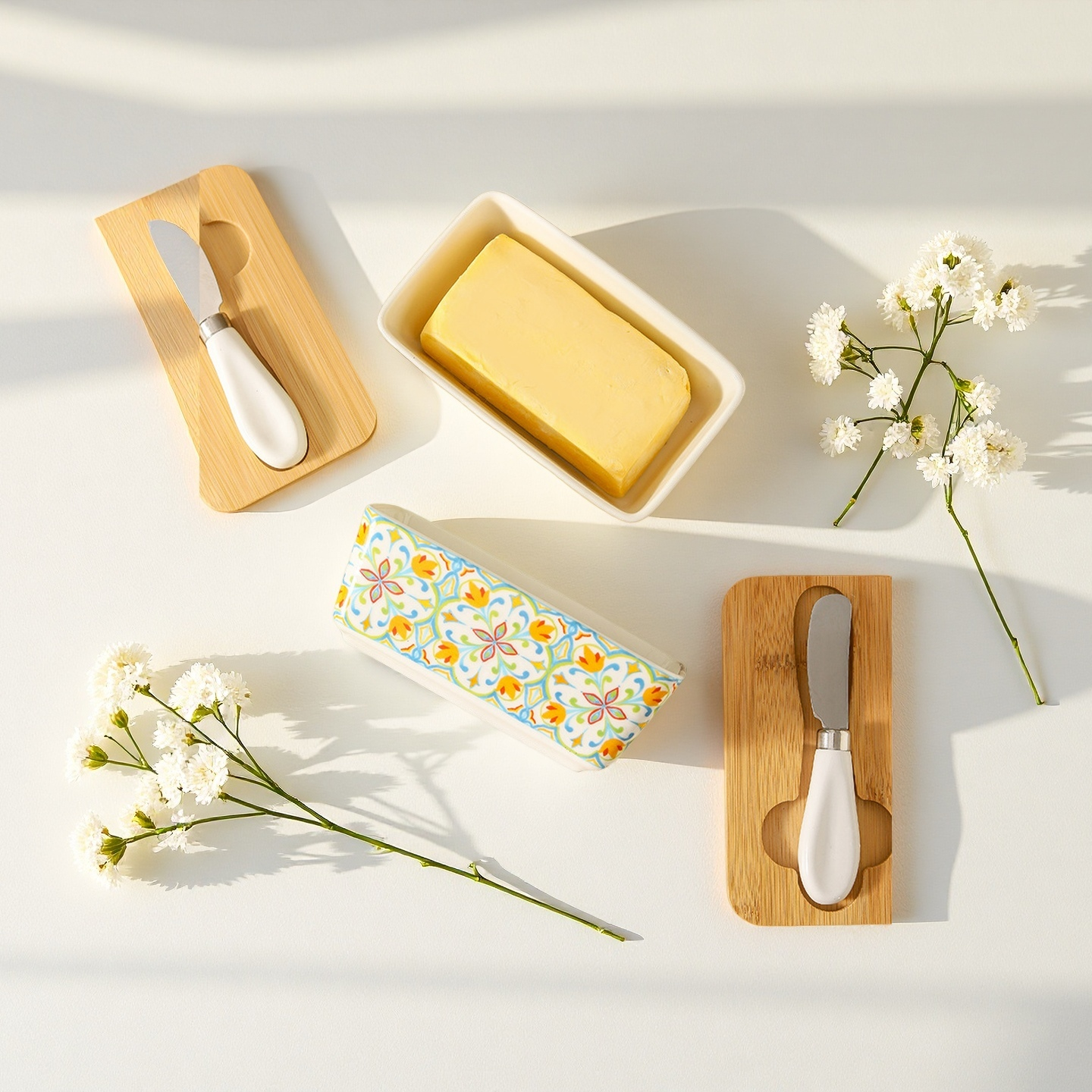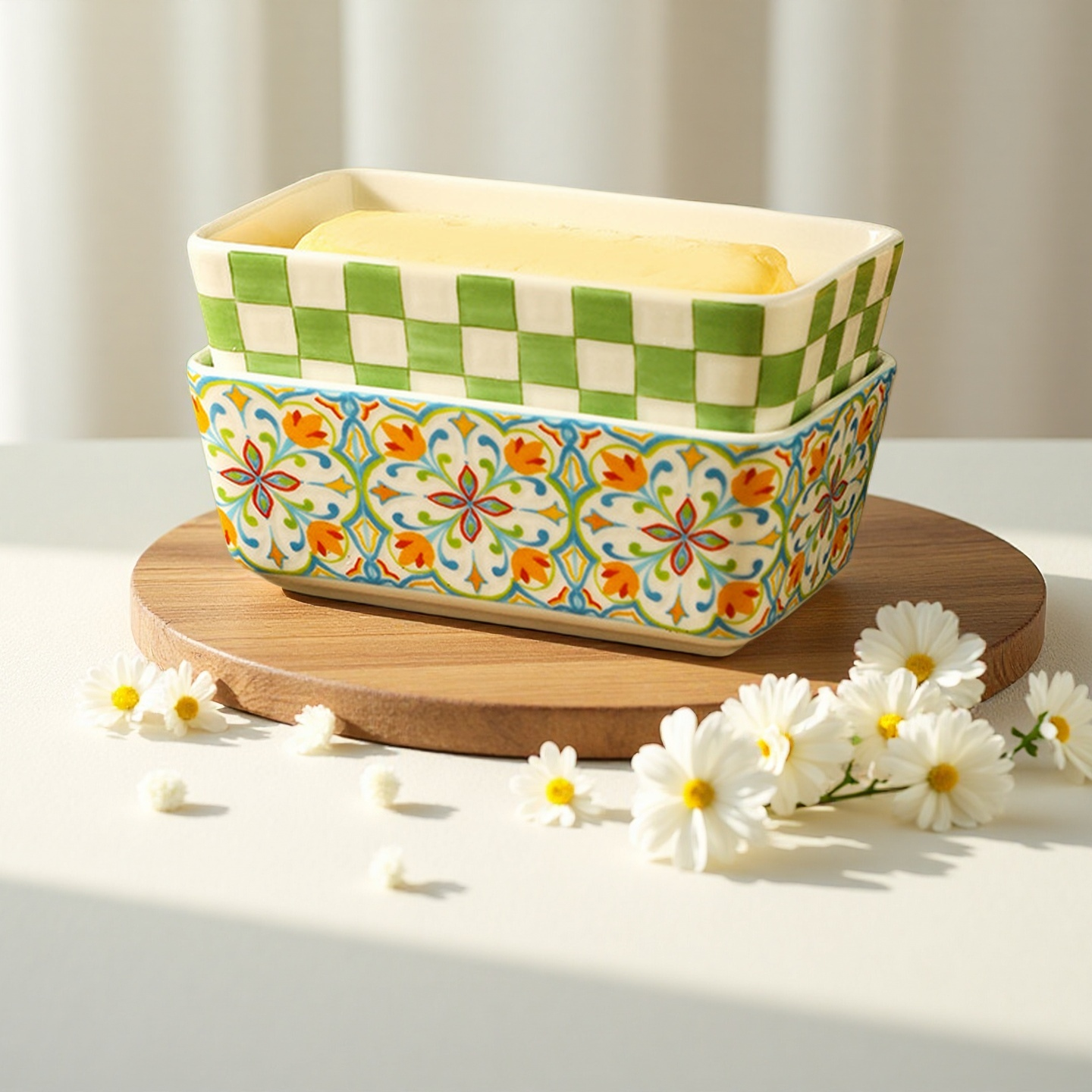 Introducing our Ceramic Butter Box with Lid. This beautifully crafted butter box is perfect for keeping your butter fresh and your kitchen countertops organized. Made from high-quality ceramic, it's durable and easy to clean. The design adds a charming touch to your kitchen decor. Say goodbye to cluttered countertops and hello to a more organized, stylish kitchen!